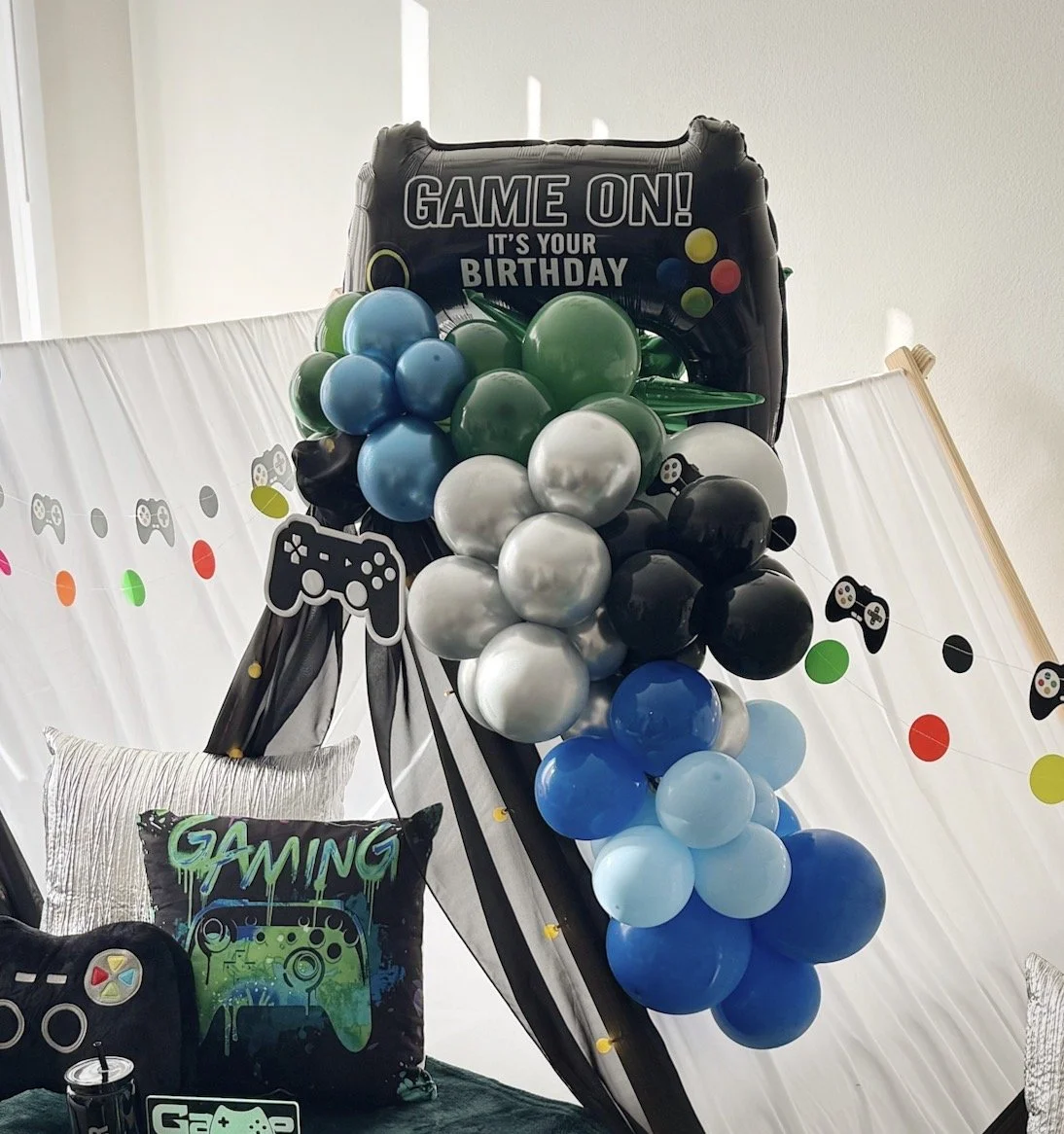 A cluster of balloons in 3-4 colors adorning the top of the tent, adding an extra pop of fun!